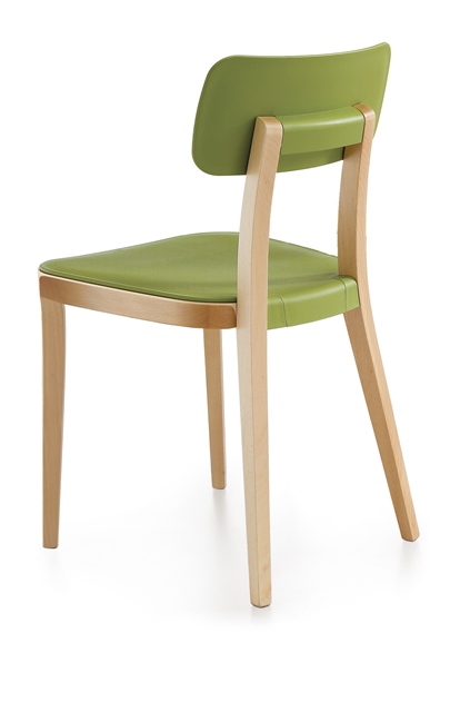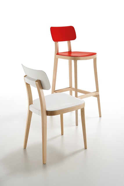 De Porta Venezia collectie combineert kunststof met hout. De zit kan eventueel bekleed worden.