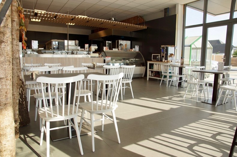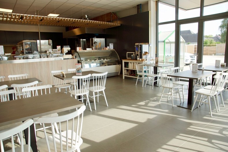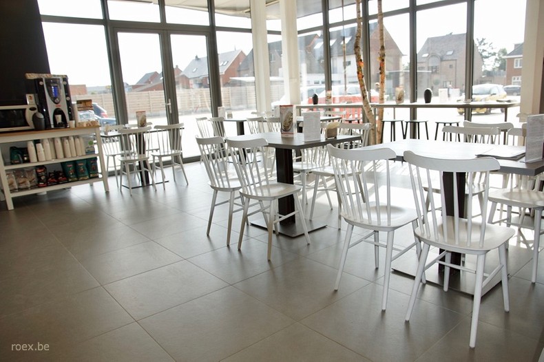 Mooie brasserie in de AD Delhaize vestiging te Hamont. De Ton Ironica stoelen in antiek witte kleur, de Pedrali Babila barkrukken en Roex Seating Solutions tafels met industrieel onderstel en massief eiken blad vormen een harmonieus geheel.