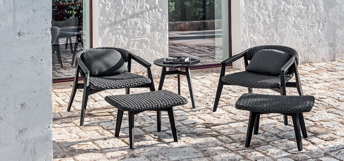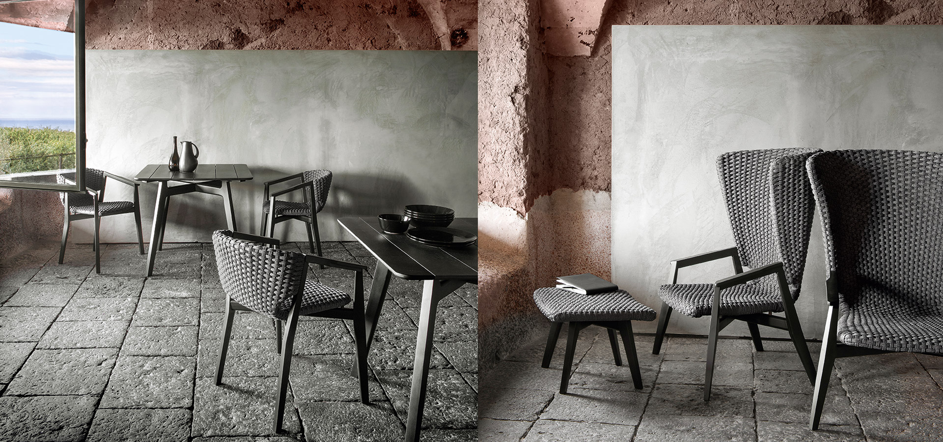 Dankzij het gebruik van innovatieve materialen werd de prachtige collectie Ethimo Knit met oog voor detail gecreëerd. Het frame is van teak of zwart mahoniehout, de zit uit een geweven stof speci vervaardigd voor buitengebruik.
