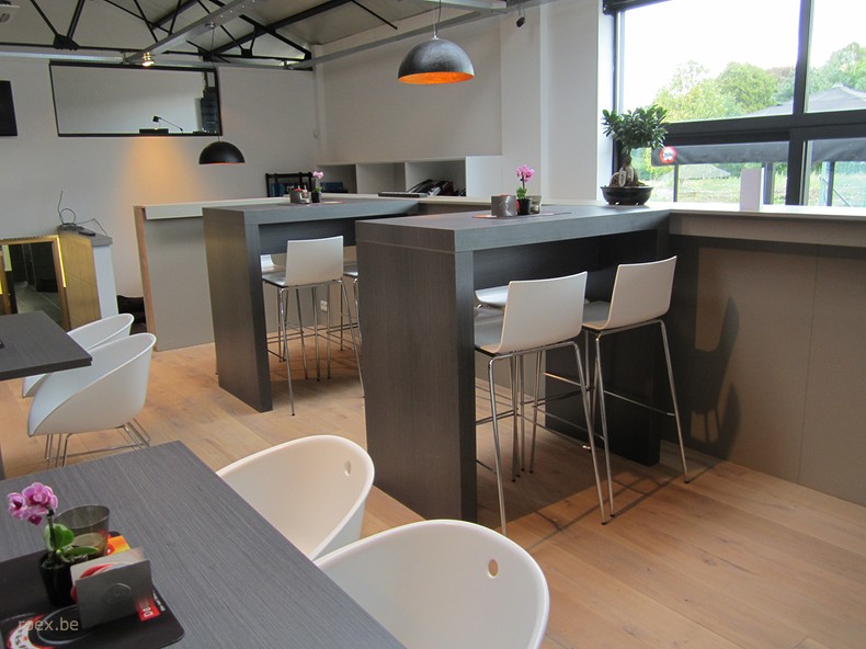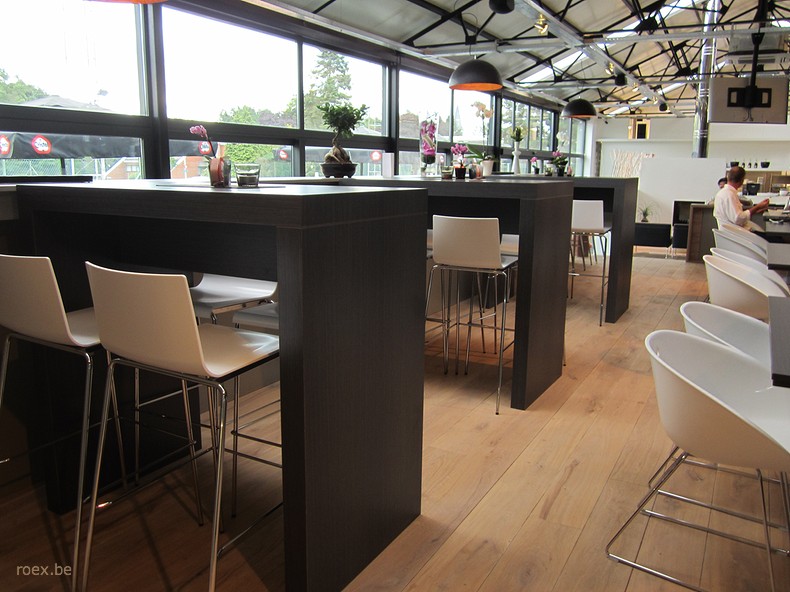 Bij de inrichting van de tennisclub in Alken werd met verschillende zithoogtes gewerkt: een lounge hoek, stoelen en barkrukken aan de toog en hoge tafels.