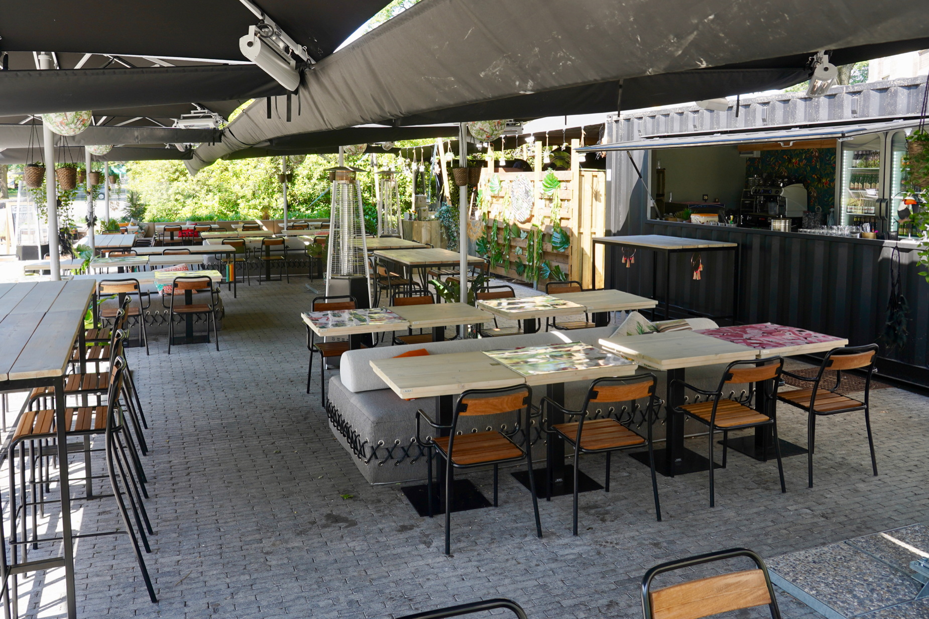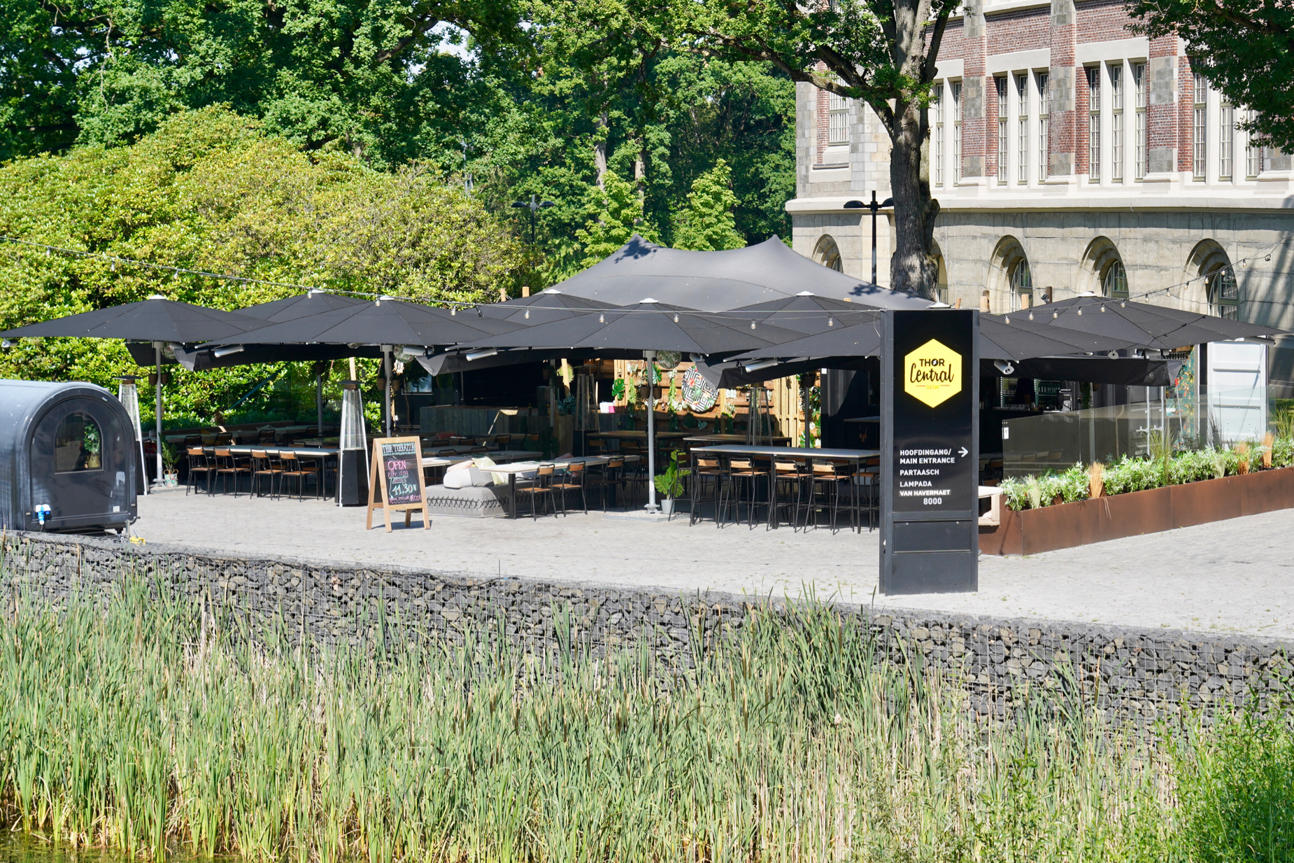 Dankzij de parasols met ingebouwde verlichting en verwarming blijft het gezellig vertoeven, zelfs als het wat frisser wordt.