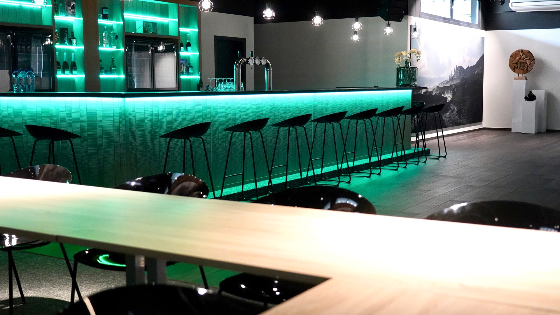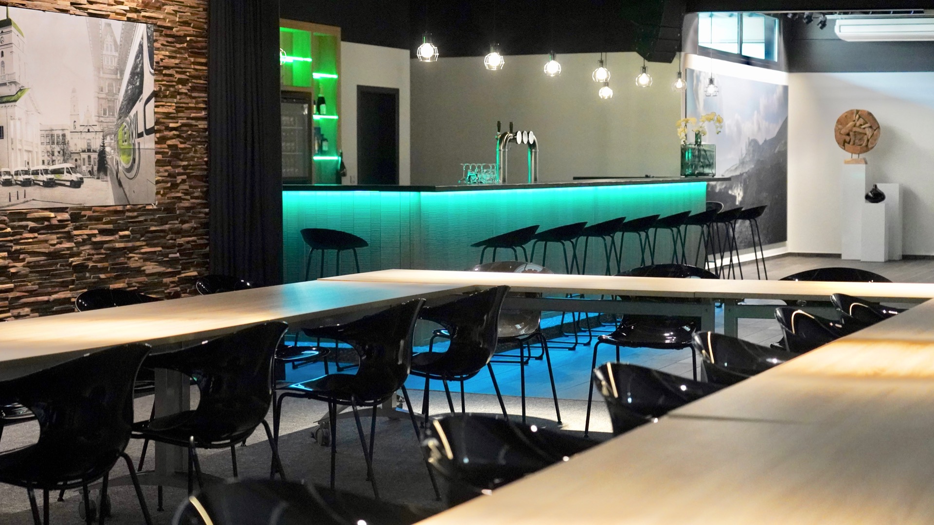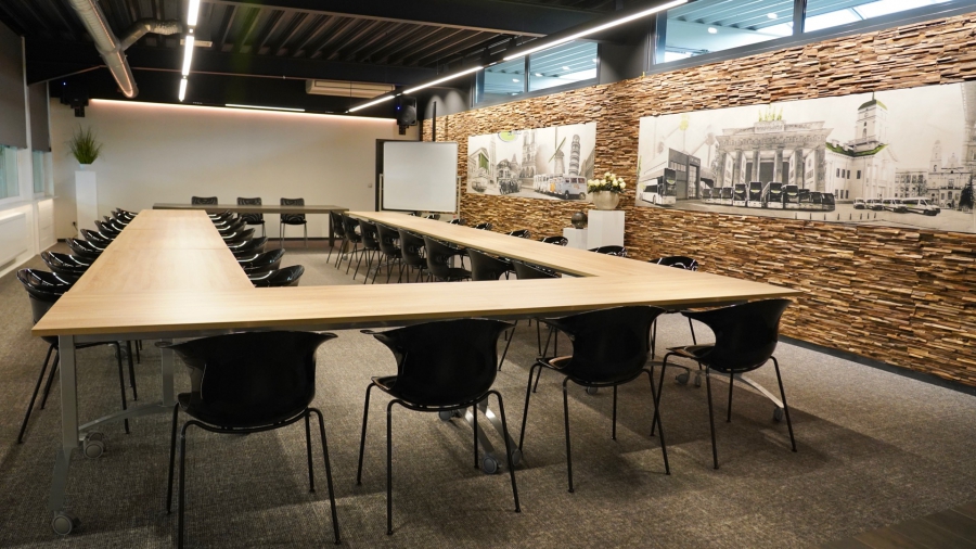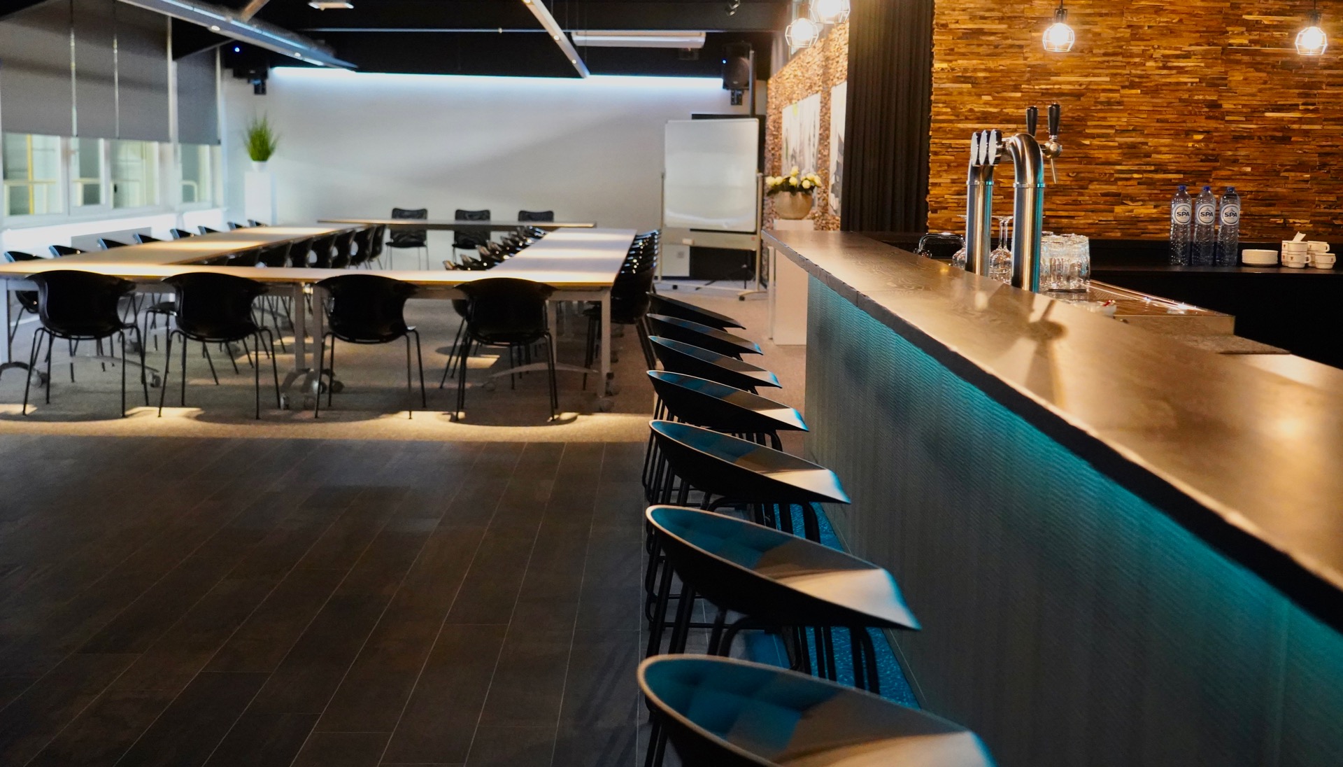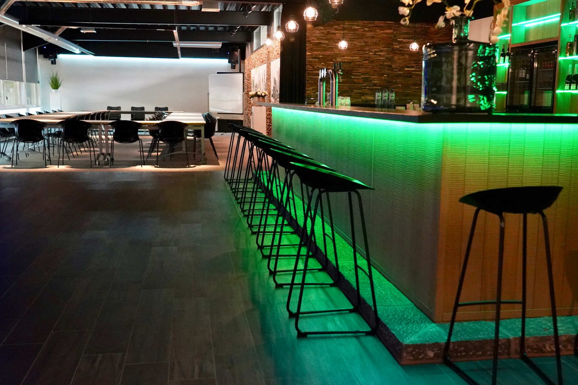 When work meets pleasure. De splinternieuwe opleiding- / annex feestruimte bij touringcarbedrijf De Wilg werd comfortabel en trendy ingericht.